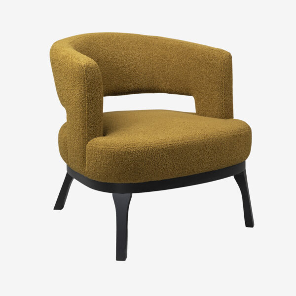 Comfortable armchair with round details and an open back. This Laguna fauteuil is made of fabric Doodle 08 and has a wooden base.